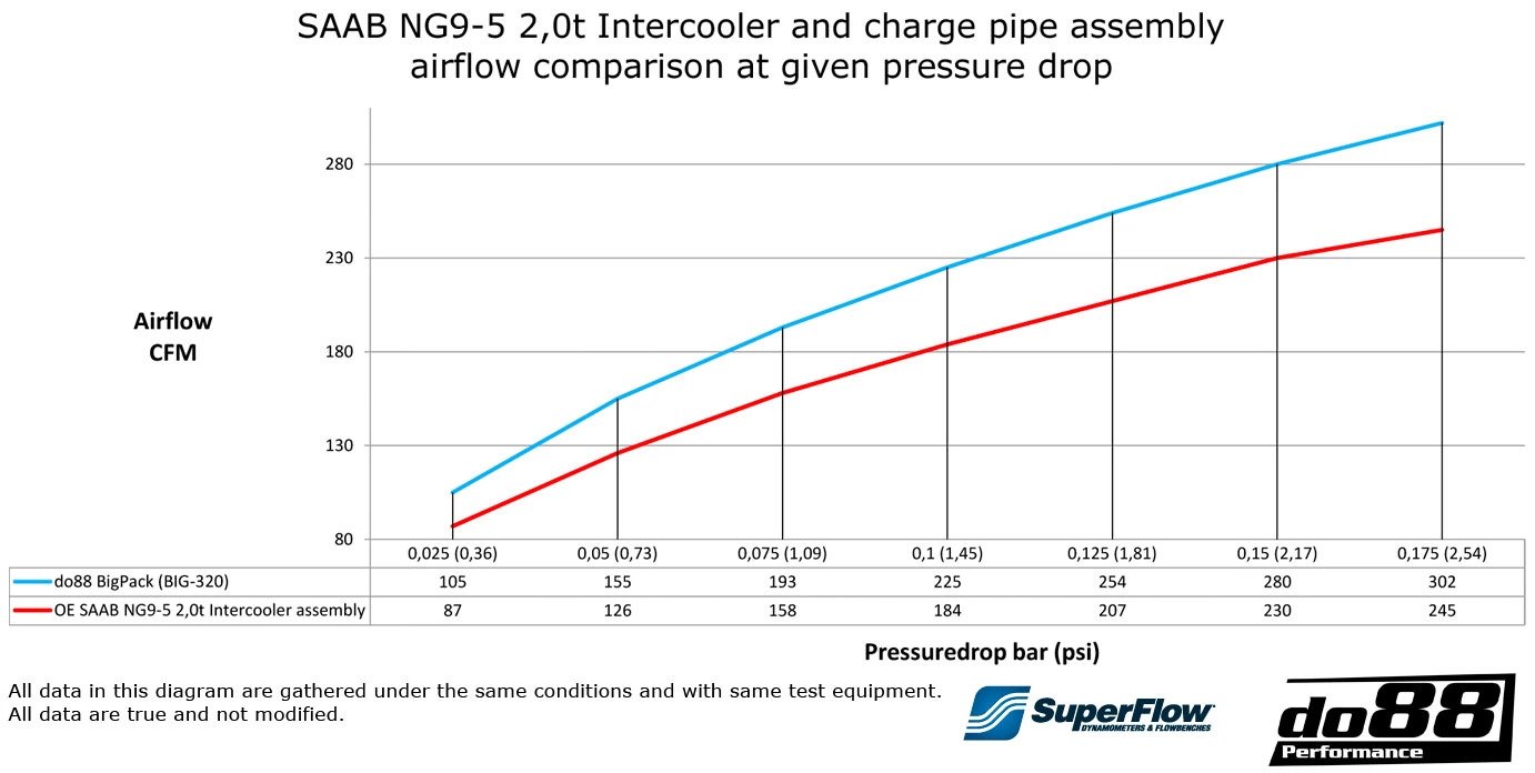 This diagram shows the charge air flow at different pressure drops of do88 BigPack compared to OEM intercooler and pipes: